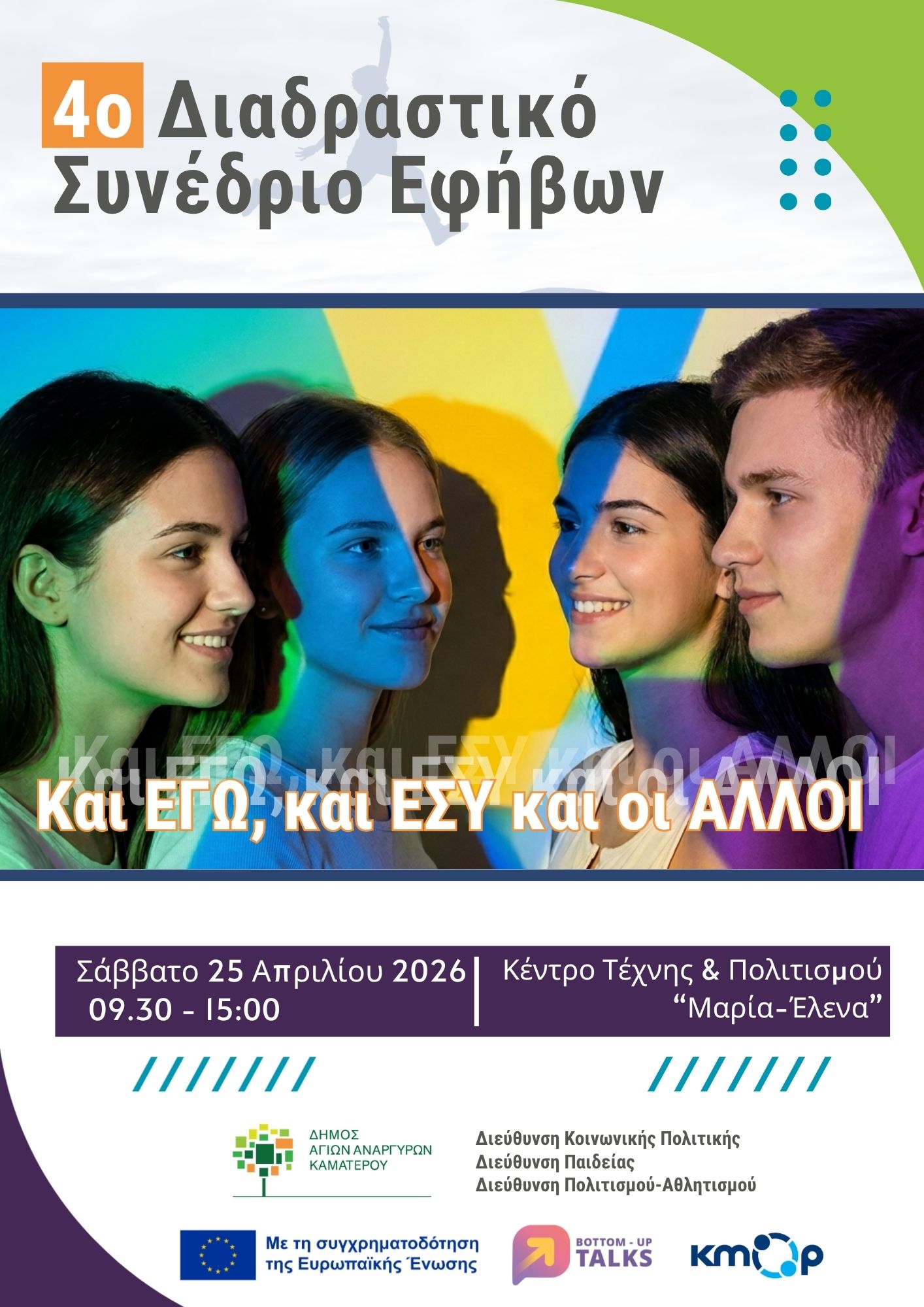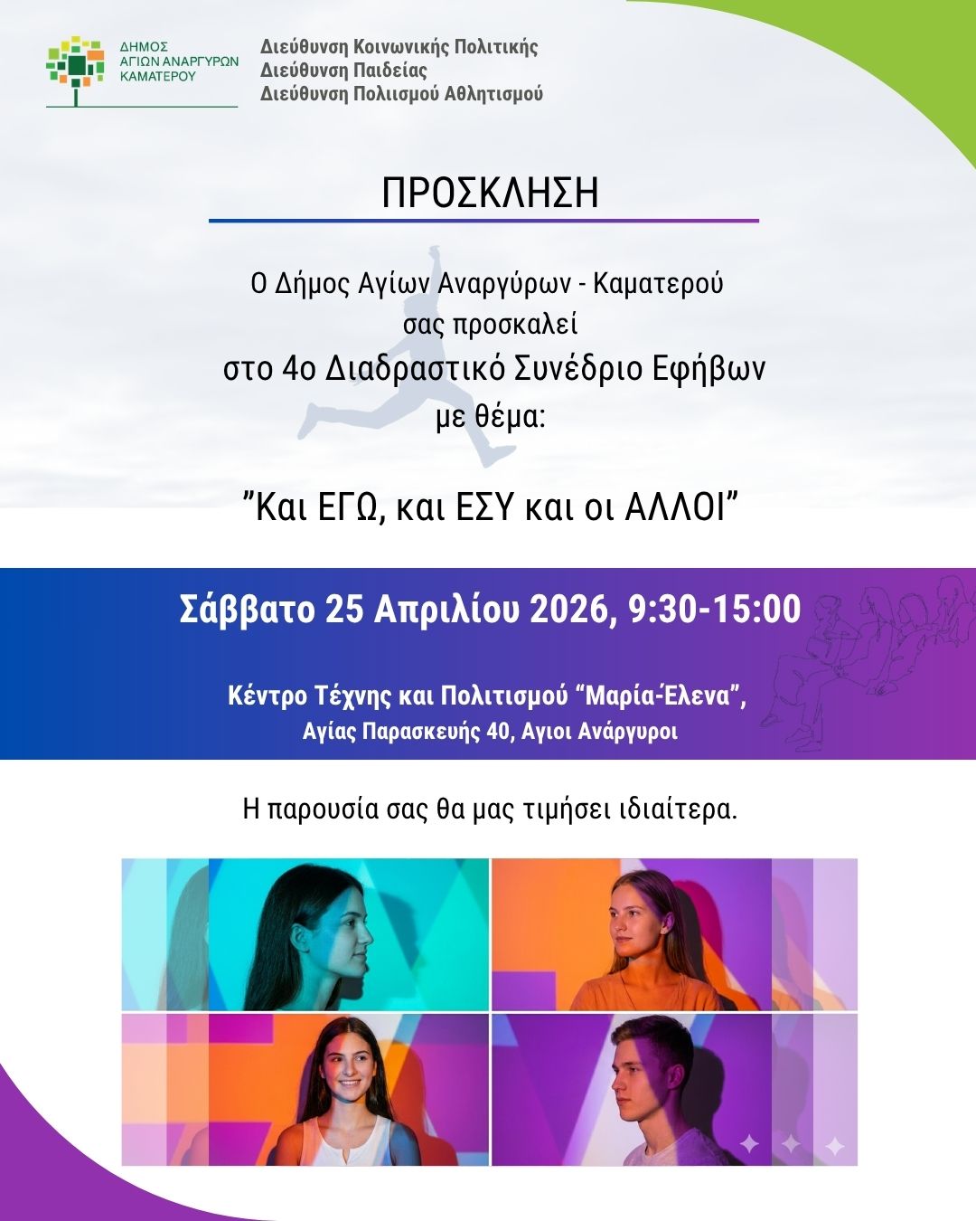 Σας ενημερώνουμε ότι το Σάββατο 25 Απριλίου 2026 από τις 09.30-15.00 στο Κέντρο Τέχνης και Πολιτισμού «Μαρία- Ελενα» θα πραγματοποιηθεί το 4ο Διαδραστικό Συνέδριο Εφήβων με τη συμμετοχή ψυχολόγων, εκπαιδευτικών, κοινωνιολόγων,  μαθητών. Στο συνέδριο θα επισημανθούν τα προειδοποιητικά σημάδια για την αναγνώριση της βίας, θα παρουσιαστούν βίντεο και βιωματικά δρώμενα, ενώ θα αναλυθούν και οι δυσκολίες των διαφυλικών σχέσεων και οι προκλήσεις.